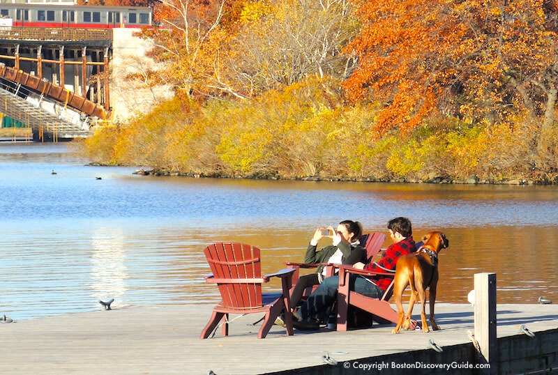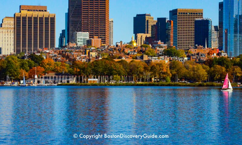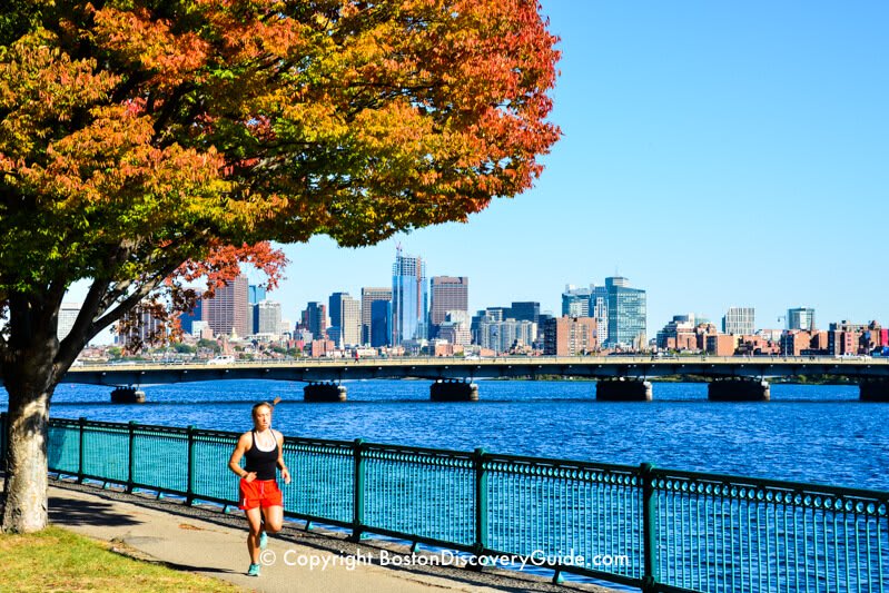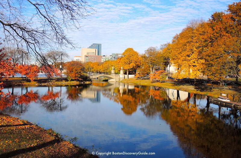The leafy Boston Esplanade, the long skinny park stretching along the Charles River from Beacon Hill to beyond Back Bay, turns into a ribbon of gold and orange in October when Boston's fall foliage begins to reach its peak.