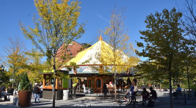 To enjoy more colorful trees along the Greenway, continue walking north to the North End and stop for a carousel ride to enjoy the autumn sunshine.