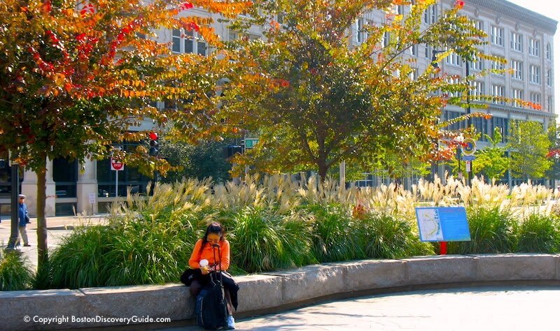 Trees, shrubs, perennials, and ornamental grasses along the Rose Kennedy Greenway extend Boston's fall foliage display in areas formerly devoid of any color other than gray, and their brilliant fall hues draw crowds of admirers.