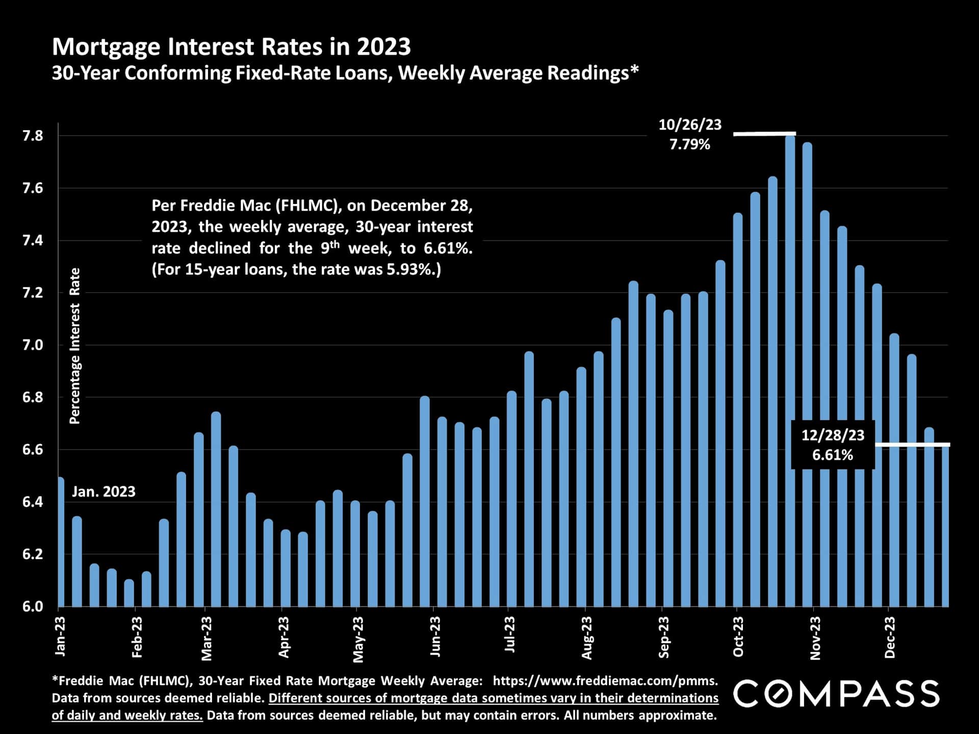 Happy New Year! With the ringing in of 2024, the real estate market looks bright given the recent drop in mortgage rates. In the last 2 months of 2023, the average, weekly, 30-year mortgage interest rate dropped from 7.79% to 6.61%. The economy also saw a year end rally - the S&P Index was up 25% and the Nasdaq up 45% in 2023.