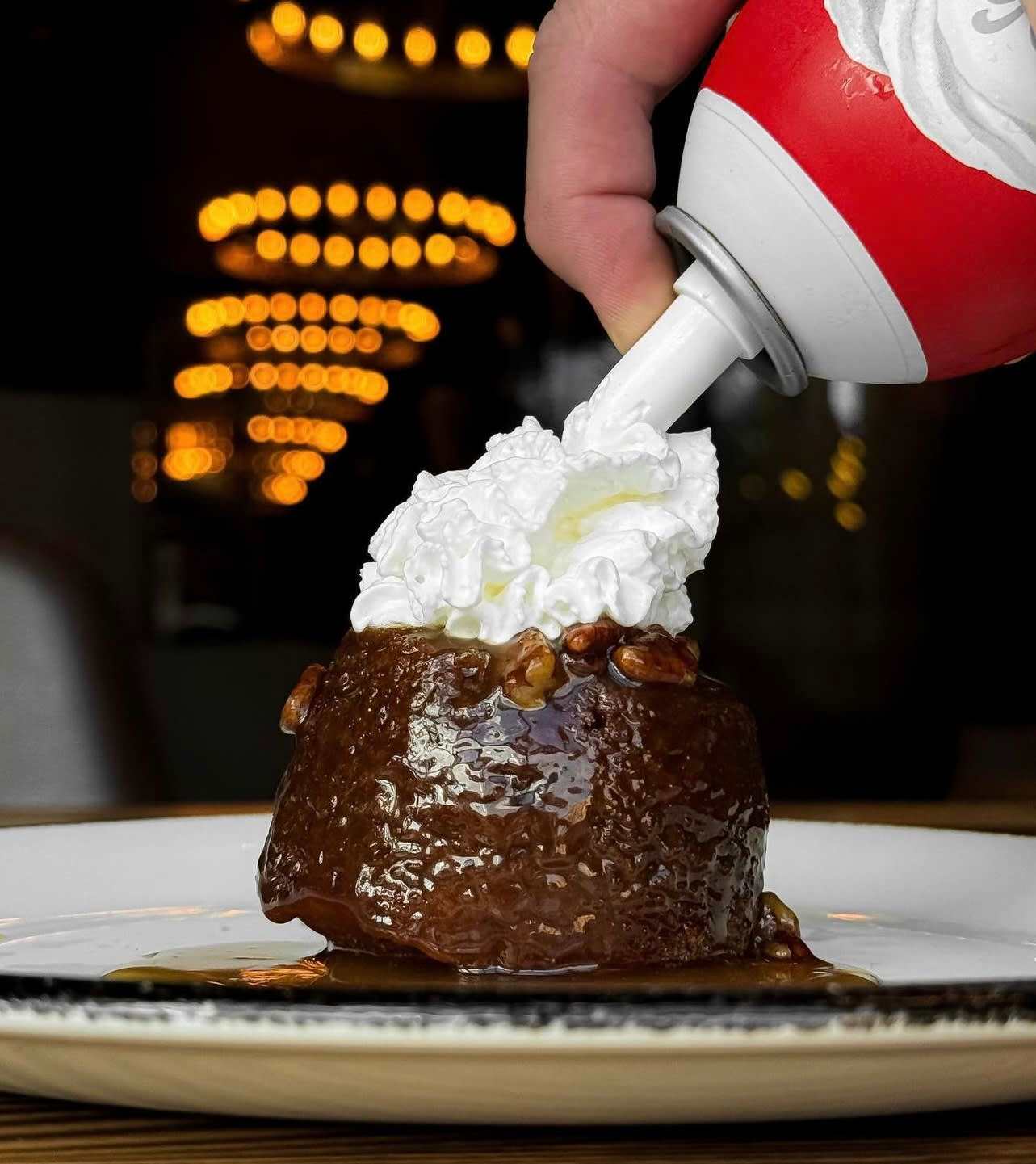 Sticky Toffee Pudding topped with caramel sauce & whipped cream