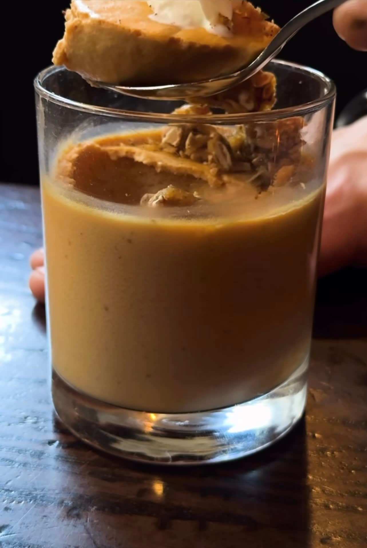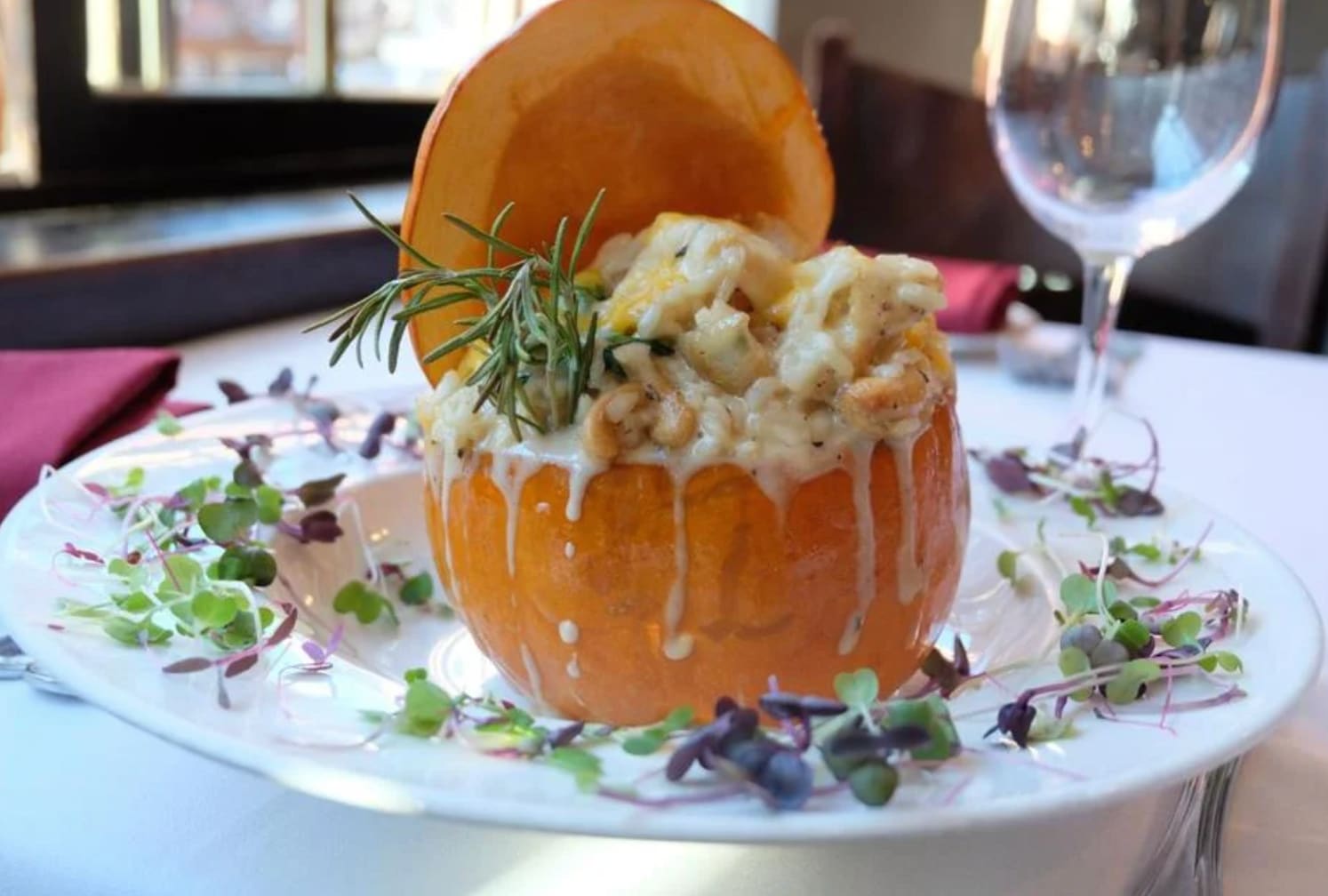 Pumpkin risotto baked & served inside a sugar pumpkin, featuring chicken, cranberries, cashews, caramelized onion, spinach & Vermont maple syrup topped with shredded cheddar jack cheese.