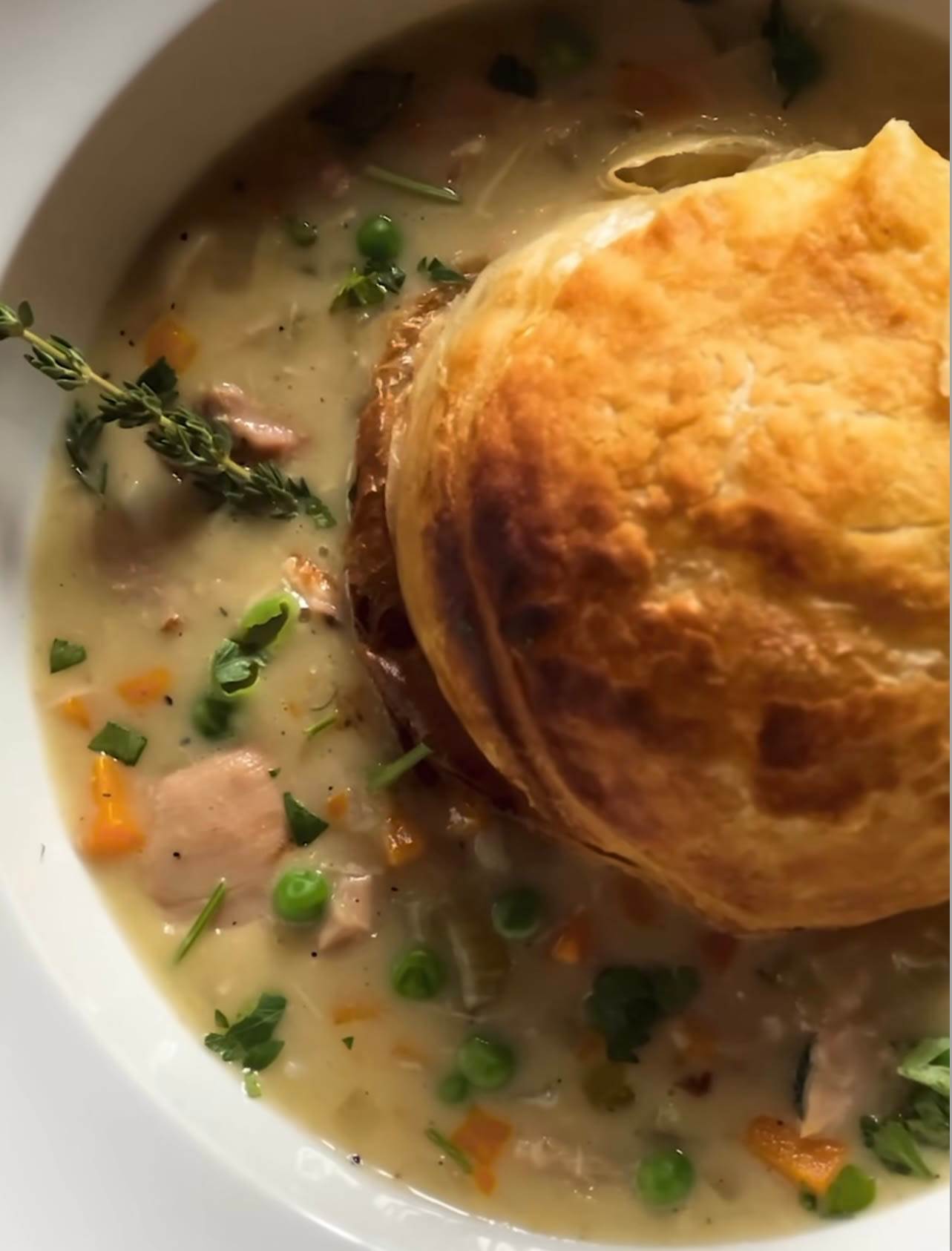 Savory chicken with carrots, peas, onion, celery, thyme & phyllo