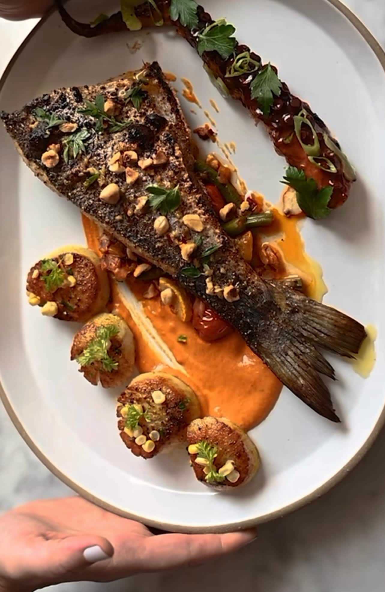 Offered as an 'entreé to share' for 2+ people, the Piatto Di Mare features whole roasted branzino seared scallops, grilled octopus, crispy potatoes & broccolini